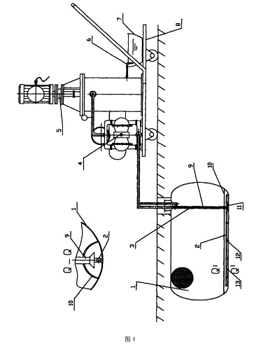 所述的噴油橫管2每間隔300-500毫米的位置設(shè)置有一噴油口13(本附圖給出每380毫米設(shè)置一噴油口或一對(duì)噴油口)。第一位置的噴油口13設(shè)置在噴油橫管2的底部,相繼第二位置的噴油口13設(shè)置噴油橫管2的側(cè)壁上,為兩個(gè)對(duì)稱(chēng)的噴油口13,如此交錯(cuò)布置,噴油口直徑選為Φ20毫米。在噴射橫管2三個(gè)不同位置焊有卡箍12,卡箍12下支腳座落在防爆儲(chǔ)罐1的罐底上;交錯(cuò)設(shè)計(jì)噴油口13的位置,其目的在于增強(qiáng)清污隧道10內(nèi)清潔油攪動(dòng)油泥的沖力并形成油、污混合流,同時(shí)又吸油管9受到氣動(dòng)隔膜泵4的吸力,迫使清污隧道10內(nèi)油、污混合流的流動(dòng)。